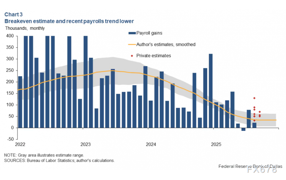 这一数字也远低于维持失业率稳定所需的“损益平衡”水平——高盛估计约为每月7.5万人。值得注意的是,这还只是平衡估算区间的上沿。达拉斯联储经济学家Anton Cheremukhin的估算更为保守,认为平衡水平仅在3万人左右,远低于两年前约25万的估计值。